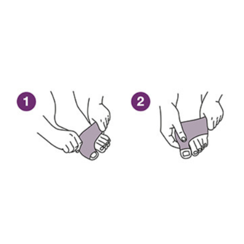 Netejar i assecar l'àrea de la pell que estarà en contacte amb el producte. Introduir el peu per la banda (tipus xancleta) allotjant el primer dit del peu al sortint de la peça. Assegurar que el gel queda correctament col·locat sobre el galindó.