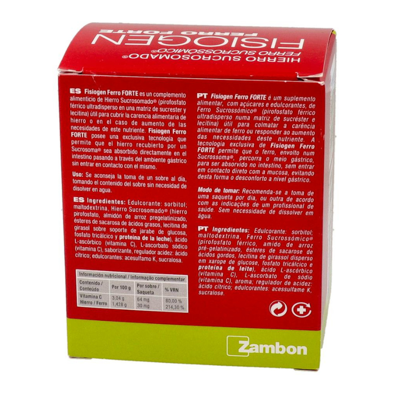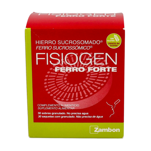 Fisiogen Ferro Forte és un complement alimentari a base de ferro liposomat indicat per a casos d'anèmia produïts per diferents motius. Cada sobre conté 30mg de ferro. Característiques: Ara el teu fisiogen ferro forti de sempre en sobres per facilitar-ne l'absorció. Ús: Prendre un sobre al dia. No necessita aigua. Aquest complement està recomanat per a qualsevol afecció que produeixi manca de ferro, especialment recomanat durant l'embaràs. El seu agradable sabor i la textura granulada fan de Fisiogen Ferro Forte la forma més senzilla de prendre ferro, perquè no necessita aigua i es pot portar còmodament a qualsevol lloc. Aquest complement està recomanat per a qualsevol afecció que produeixi manca de ferro, especialment recomanat durant l'embaràs. El seu agradable sabor i la textura granulada fan de Fisiogen Ferro Forte la forma més senzilla