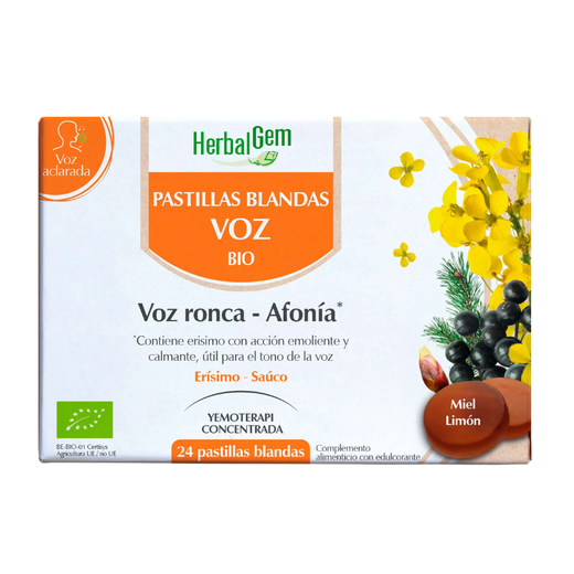 Les Pastilles Toves Veu Bio d'Herbalgem són una solució natural i ecològica per mantenir la salut de les teves cordes vocals. Formulades amb eríssim, saüc, groseller negre, pi rovell, mel i oli essencial de llimona, aquestes pastilles ofereixen una acció emol·lient i calmant, ideals per als qui utilitzen la veu amb freqüència o pateixen de ronquera ocasional. El seu sabor mel-llimona proporciona una experiència agradable.