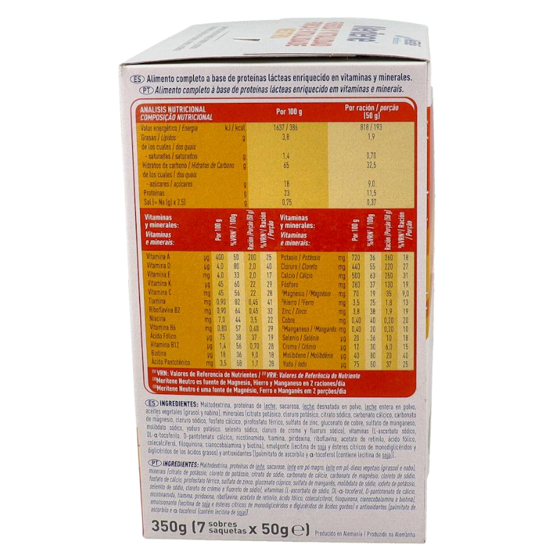 Maltodextrina, proteïnes de llet, sacarosa, llet descremada en pols, llet sencera en pols, olis vegetals, minerals (citrat potàssic, clorur potàssic, citrat sòdic, carbonat càlcic, carbonat de magnesi, clorur sòdic, fosfat càlcic, fosfat fèrric, sulfat de zinc, gluconat de coure, sulfat de manganès, molibdat sòdic, iodur potàssic, selenit sòdic, clorur de crom i fluorur sòdic E, vitamin càlcic, nicotinamida, B1, B6, A, àcid fòlic, D, K, B12 i biotina), emulgent (lecitina de soja) i antioxidants (palmitat d'ascorbil i alfa-tocoferol).