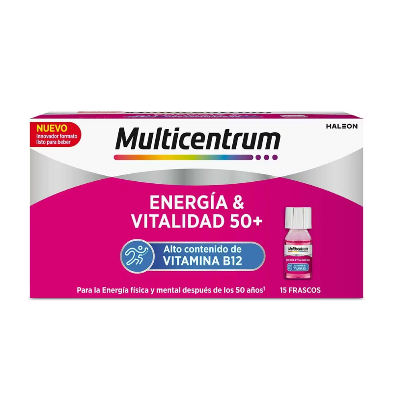Multicentrum Energia & Vitalitat 50+ és un complement alimentari per a adults majors de 50 anys amb un alt contingut de vitamina B12, Niacina i Zinc.