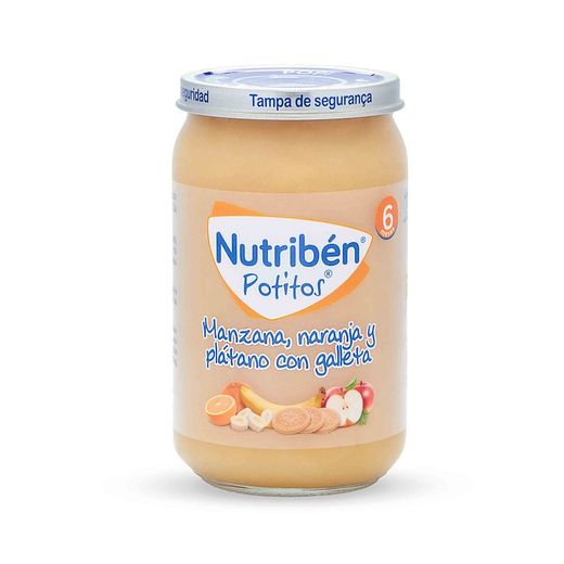 Nutribén® Poma, taronja i plàtan amb galetes és un aliment infantil destinat per a nens a partir del 4t mes.