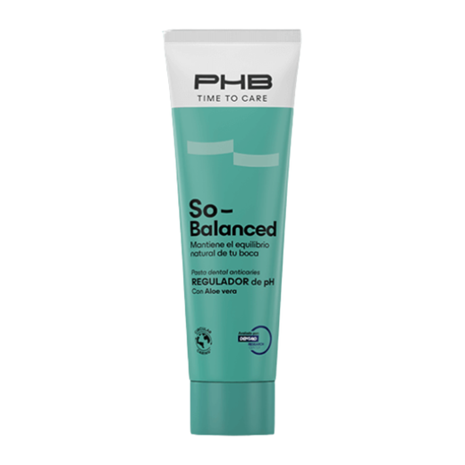 La pasta dental anticàries PHB So-Balanced amb REGULADOR de pH, Aloe Vera i el 96% d'ingredients d'origen natural protegeix el teu microbiota bucal, cuida les teves dents i genives, i hidrata la teva boca mantenint un alè fresc.