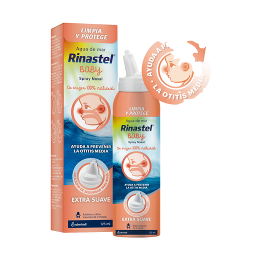 Rinastel Baby Spray Nasal 125 ml és una solució hipertònica d'aigua de mar d'origen 100% natural, combinada amb xilitol, recomanada per a la neteja diària de les fosses nasals de nadons a partir de 3 mesos. La seva fórmula sense conservants ajuda a mantenir les vies respiratòries netes i protegides, reduint el risc d'infeccions otorinolaringològiques (ORL) com l'otitis mitjana, la sinusitis i la faringoamigdalitis.