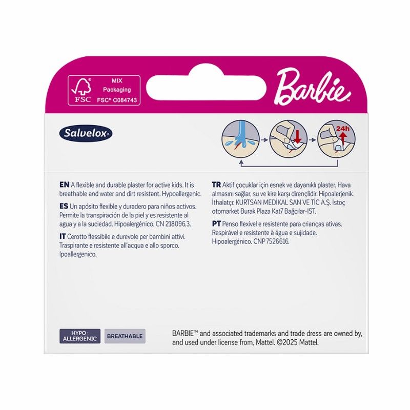 Els apòsits Salvelox Barbie vénen en tres mides diferents, incloent una nova forma ovalada més gran. L'apòsit ovalat té adhesiu a tot arreu i es manté bé al seu lloc. És adequat per a ferides una mica més grans. A més, l'apòsit ovalat per a nens ve amb 10 dissenys diferents de Barbie – intenta col·leccionar-los tots!