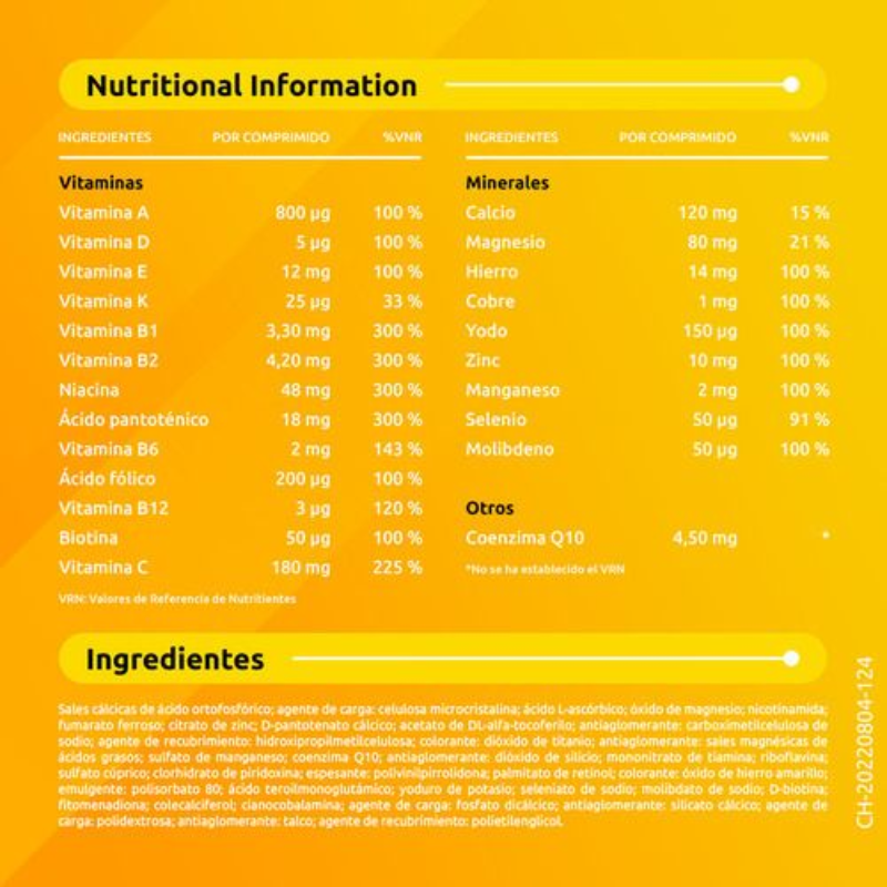 INGREDIENTS p>Sals càlciques d'àcid ortofosfòric; cel·lulosa (E 460) (agent de càrrega); àcid L-ascòrbic; òxid de magnesi; barreja de minerals [fumarat ferrós; sulfat cúpric; iodur de potassi; citrat de zinc; sulfat de manganès; selenià de sodi; molibdat de sodi; cel·lulosa; polivinilpirrolidona (E 1201) (espessant)]; coenzim Q10; nicotinamida; hidroxipropilmetilcel·lulosa (E 464) (agent de recobriment); acetat de D-alfa-tocoferil; D-pantotenat càlcic; carboximetilcel·lulosa (E 468) (antiaglomerant); retinol; sióxid de Titani (E 171) (colorant); sals magnèsiques d'àcids grassos (E 470b) (antiaglomerant); biotina; diòxid